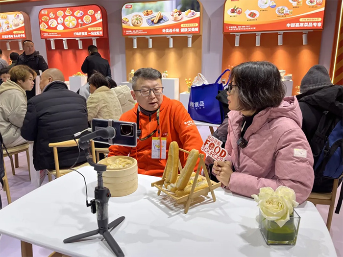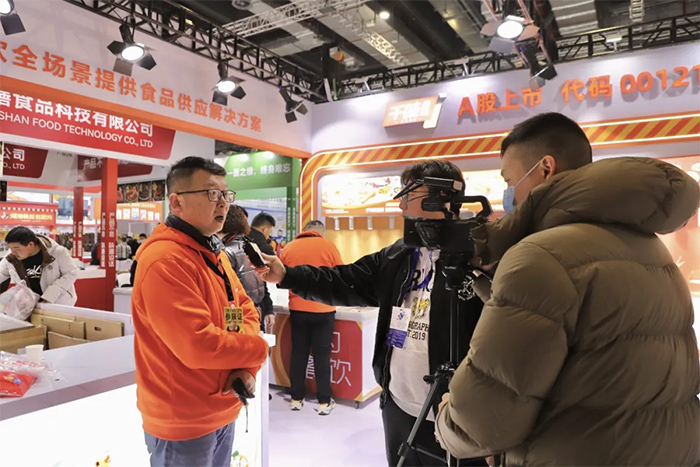 多家行業媒體和美食達人前往千味央廚展位采訪、直播,千味央廚工作人員與線上觀眾進行熱情聯動。