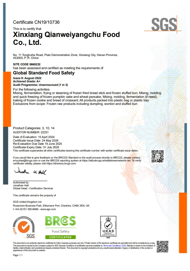 2024年,新鄉千味央廚憑借卓越的產品質量和嚴格的管理體系,榮膺BRC頒發的A+級認證。自成立以來,千味央廚始終將產品質量視為生命線,經過不斷的質量管理提升,BRC認證已由A級提升為A+級水平,這標志著千味央廚在食品安全體系、品質管控能力等方面上升到了一個新的高度,達到國際水平。